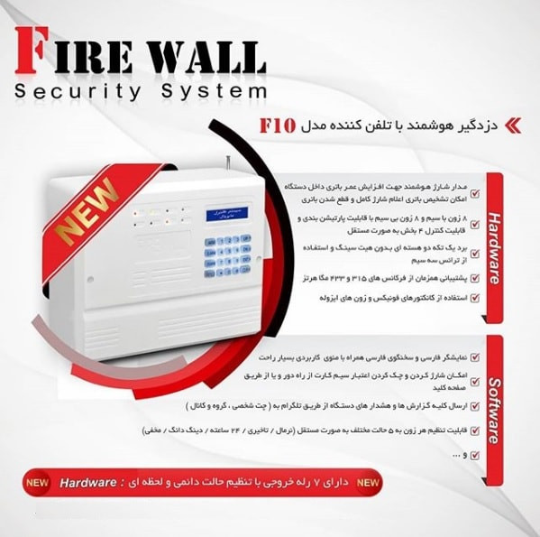 دزدگیر اماکن فایروال مدل F10 دارای تلفن کننده خط ثابت و سیم کارتی می باشد که میتوان از آنها به صورت همزمان استفاده نمود .